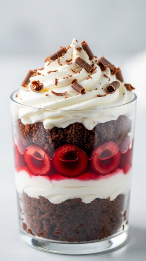 1. Layer chocolate cake crumbs, cherry filling, and whipped cream in cups.