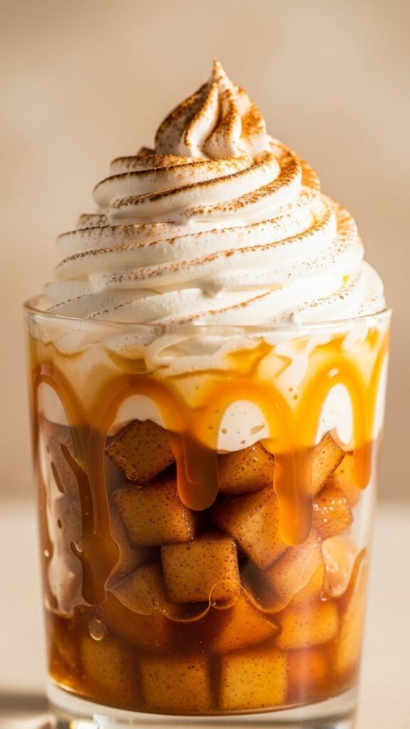 2. Layer apples in cups, drizzle with caramel, and top with whipped cream.