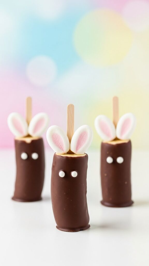 - Dip in melted chocolate, decorate with marshmallows for ears.