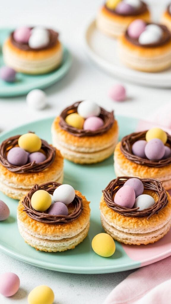 - Shape into small nests on a baking sheet. Bake 15–20 mins.