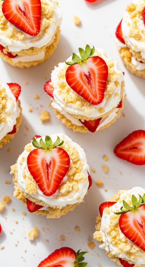 - Layer crumbled shortcake, strawberries, and whipped cream in each cup.