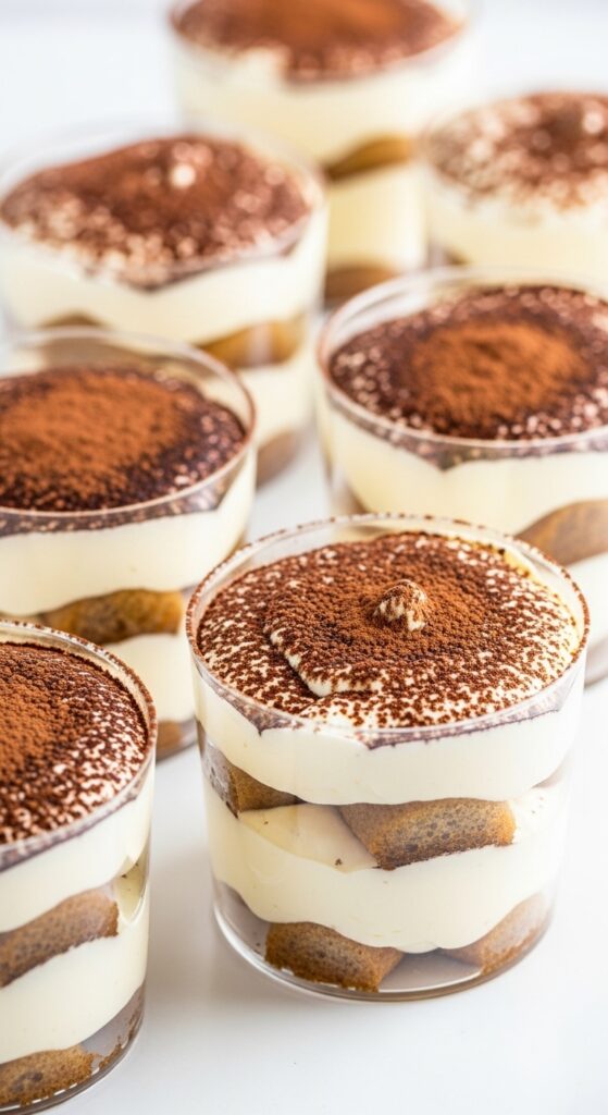 - Layer coffee-soaked ladyfingers and mascarpone mixture in mini cups.