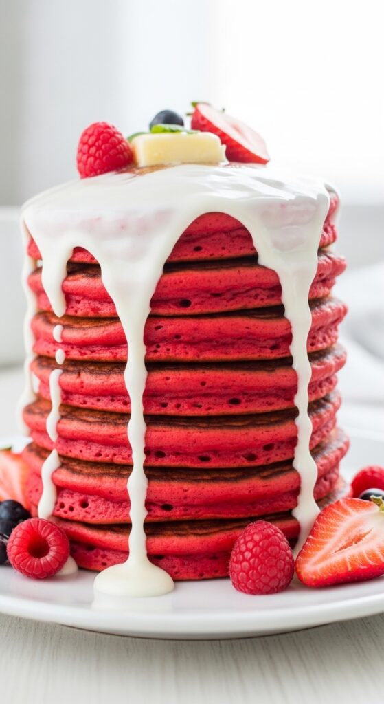 Breakfast but make it bold. Red velvet pancakes feel extra without being complicated.