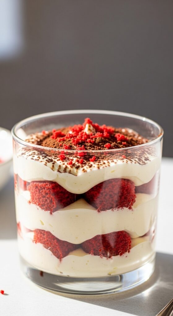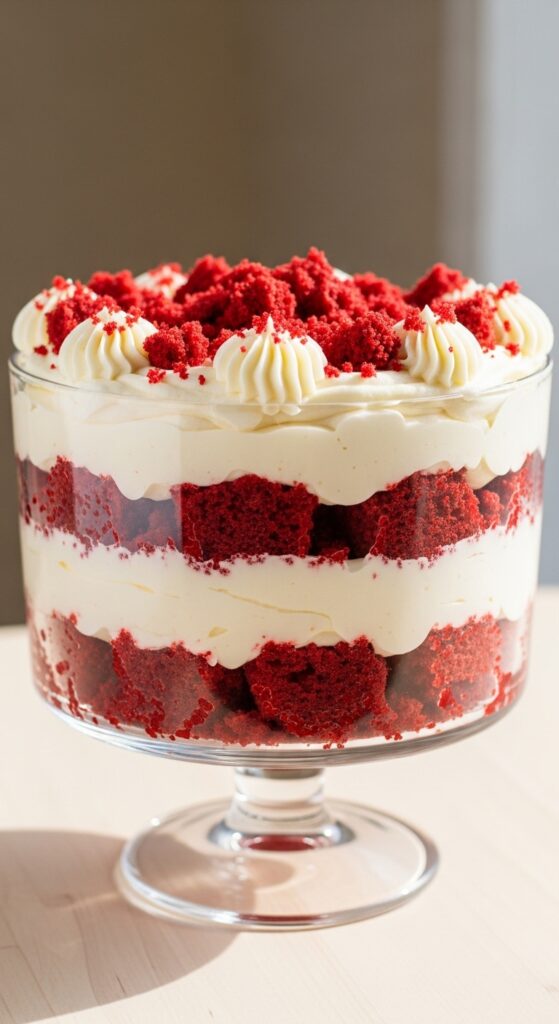 Layered desserts always impress. Red velvet trifle stacks cake, cream, and pure happiness.