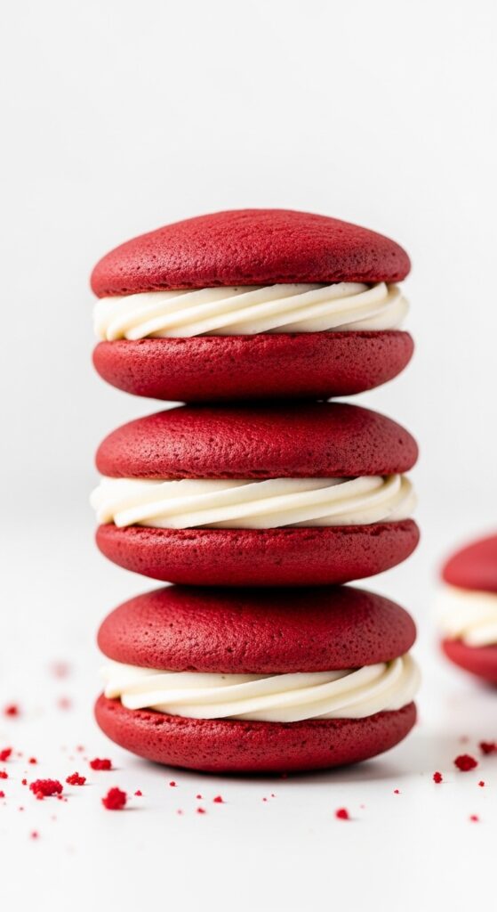 These feel playful and nostalgic. Red velvet whoopie pies sandwich cream cheese filling between soft cakes.