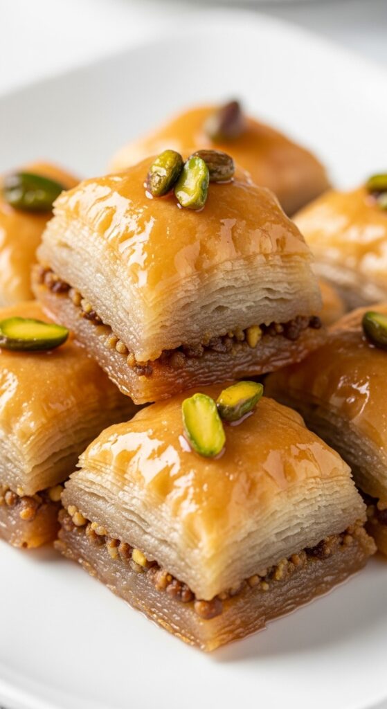 - Layer phyllo and nuts, bake until golden.