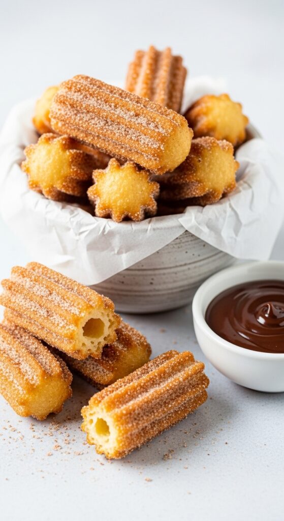- Pipe mini churros into hot oil, fry until golden.